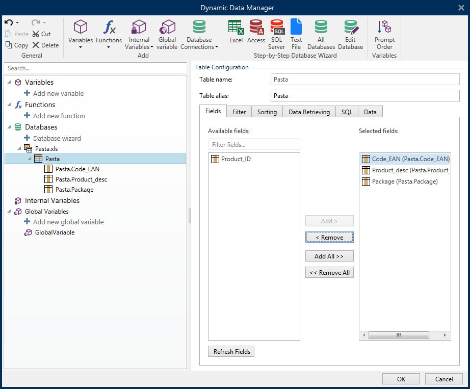 Refresh Fields rereads the connected database table and displays the refreshed available fields.