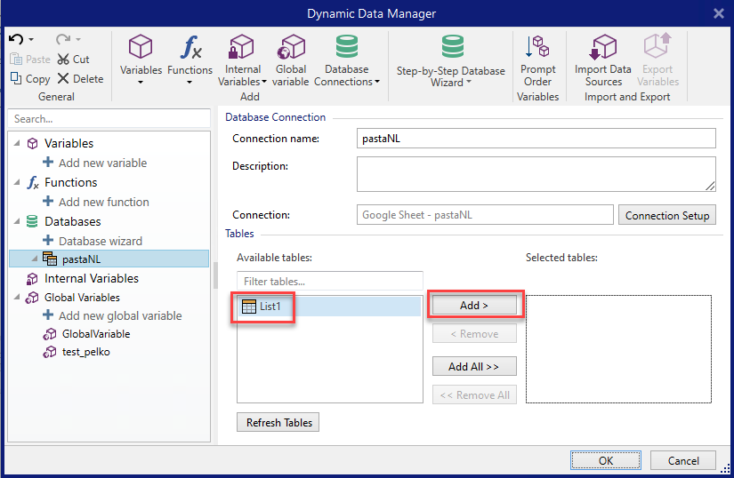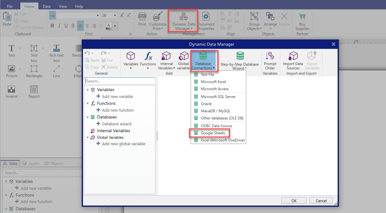 Database Connections button in the Dynamic Data Manager Ribbon and selectGoogle Sheets as your database type.