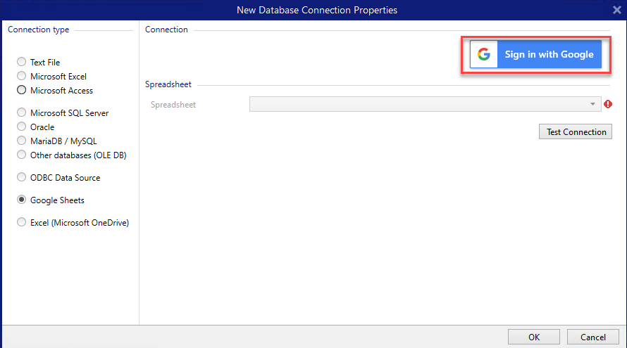 /solutions .Test Connection button starts a connection testing procedure. It shows if a connection with the selected Google spreadsheet has been established successfully. A confirmation or error message appears depending on the connection status.Your Google spreadsheet is now connected. Add the table(s) you would like to use to the