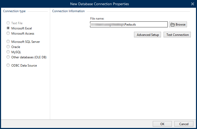 Click Database Connections button in the Dynamic Data Manager Ribbon and select Microsoft Excel as the preferred database type. New database connection properties window opens.