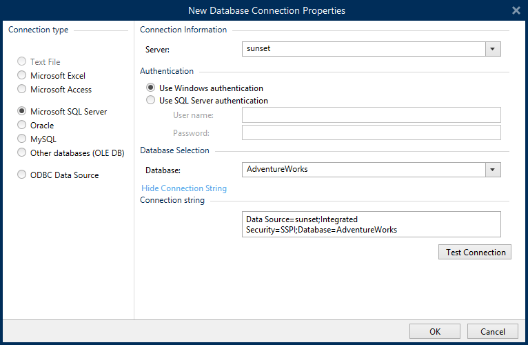 Click Database Connections button in the Dynamic Data Manager Ribbon and select Microsoft SQL Server as the preferred database type. New database connection properties window opens.