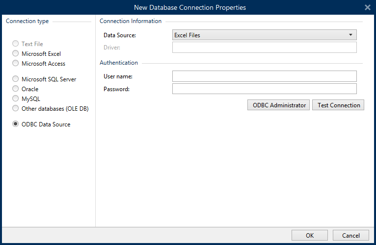 Click Database Connections button in the Dynamic Data Manager Ribbon and select ODBC Data Source as the preferred database type. New database connection properties window opens.