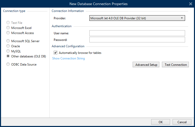 Clic your Database Connections button in the Dynamic Data Manager Ribbon and select Other Databases (OLE DB) as the preferred database type. New database connection properties window opens.