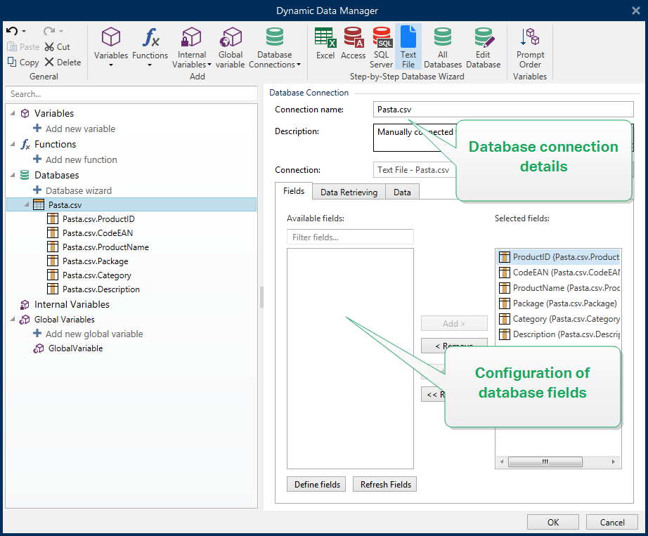 Click Database Connections button in the Dynamic Data Manager Ribbon and select Text File as the preferred database type.