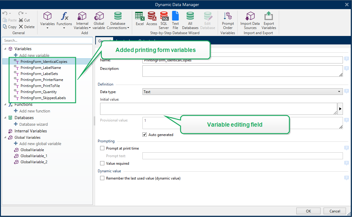 To remain in line with best-practice recommendations, Loftware suggests you to avoid editing the printing form variables. If you find editing necessary, double check that the customized data type and Input/Output rules do not interfere with label printing.