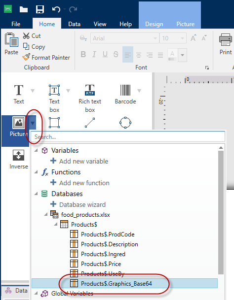 Connect your Picture objects to database fields containing Base64 content. Designer automatically recognizes Base64 text content and displays text content as images on your labels