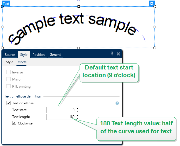 Text length: sets the portion of the ellipse to be used for displaying the text. The maximum value (default) takes the complete ellipse. Reducing the value in degrees shortens the available portion.