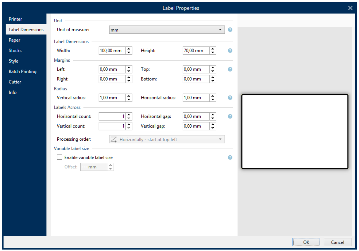 Label Properties editor selects the printer, sets label dimensions, and defines the printing paper properties.