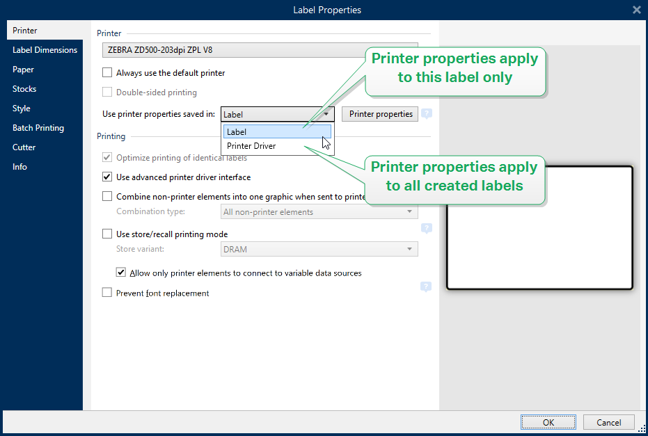 Printer Driver: When printing, Loftware takes the printer properties that you define in the printer driver. This means that all labels that share these settings print equally. E.g., if you change printing darkness in the printer driver dialog to 10, all labels print with darkness set to 10.