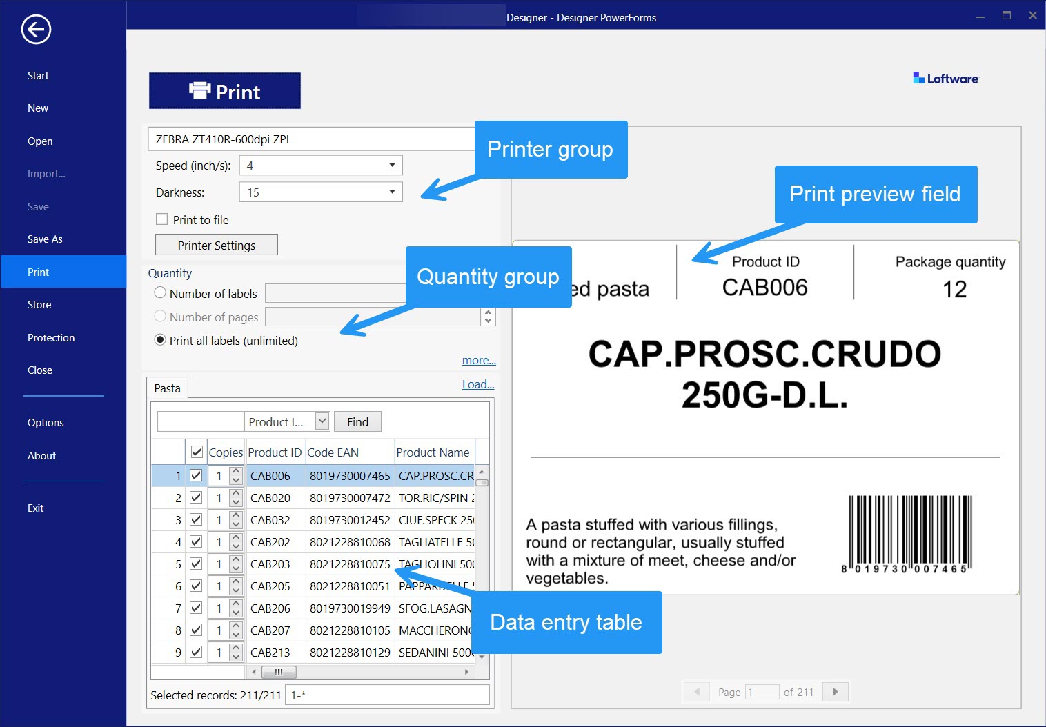 Print all labels (unlimited): prints all labels as defined by the label design. More details about this option are available here.