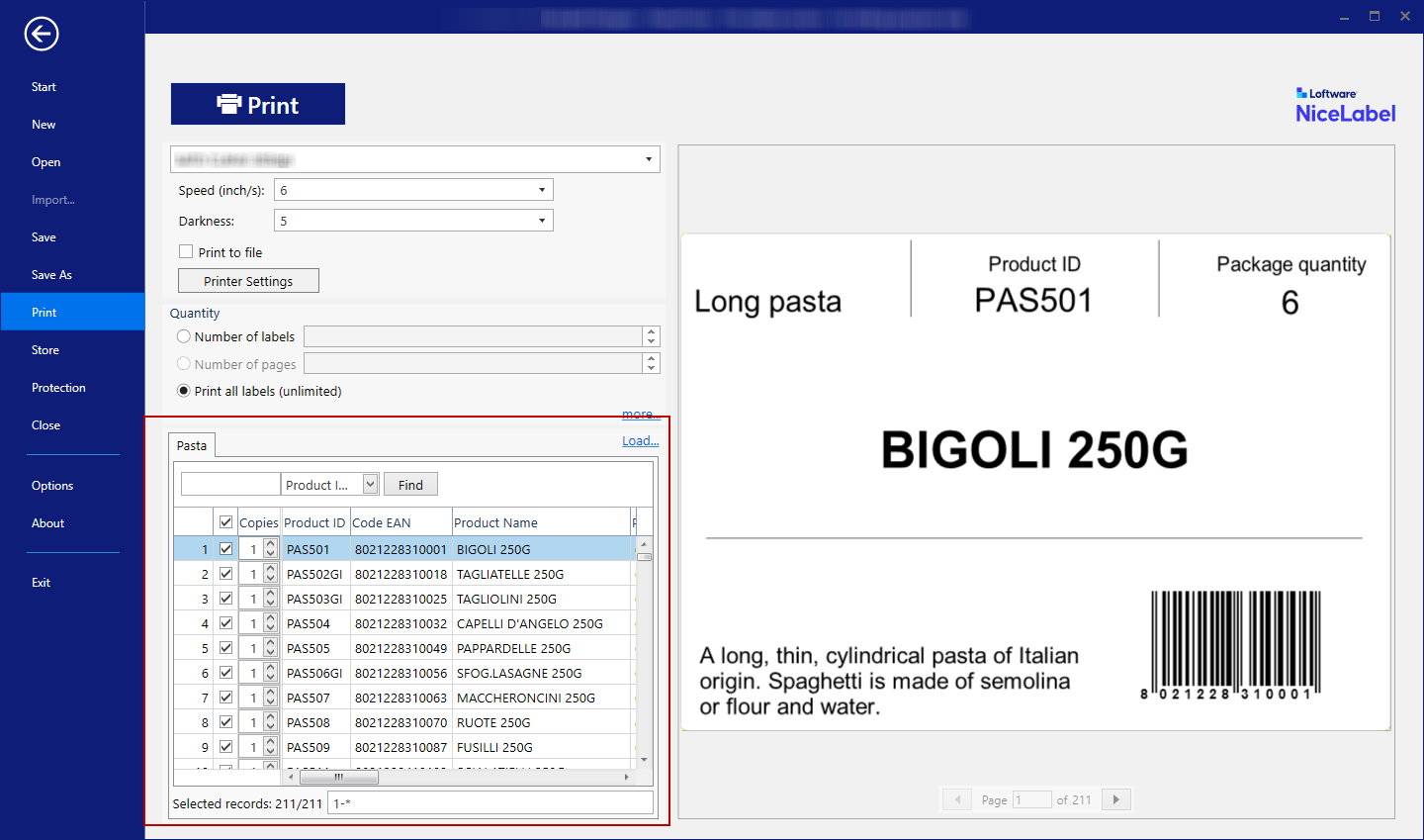 You have a database containing records of your products. It contains a field with a numeric value. This value stores the required number of label copies is stored. Select this field and let the application print the quantity of labels as specified in this field.
