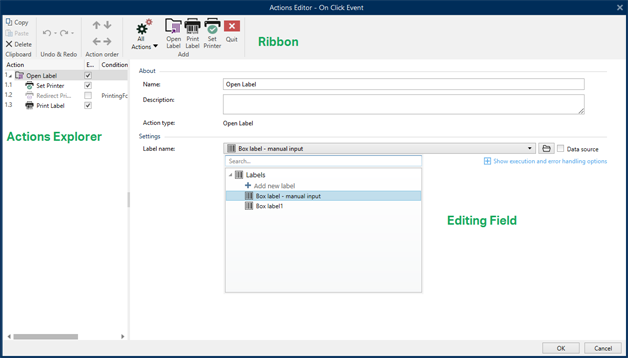 Actions Editor Dialog ribbon includes commands for adding, removing and ordering the actions. It also provides a direct access to frequently used actions.