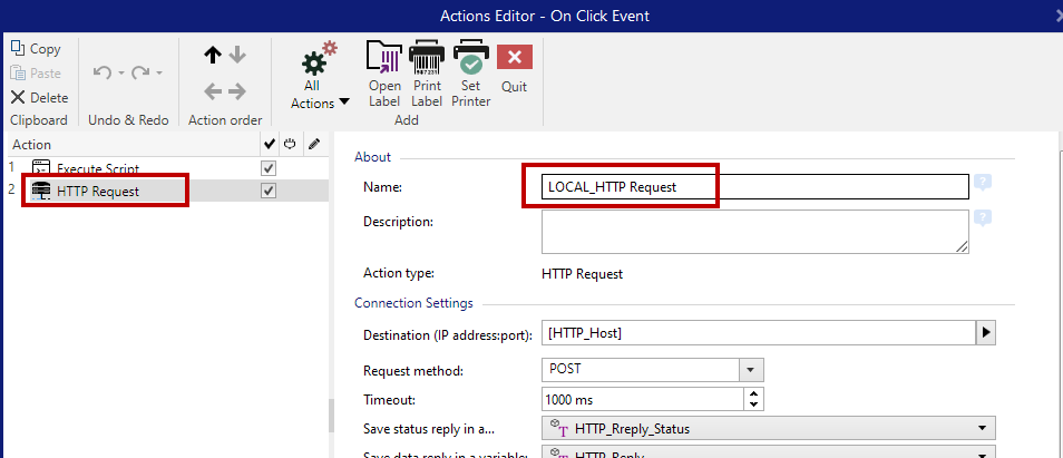 At the end of printing, you might want to send the status update to an external application using the HTTP Request action. If the printing action fails, action processing stops. In order to execute the reporting even after the failed print action, the Print Label action must have the option Ignore failure enabled.