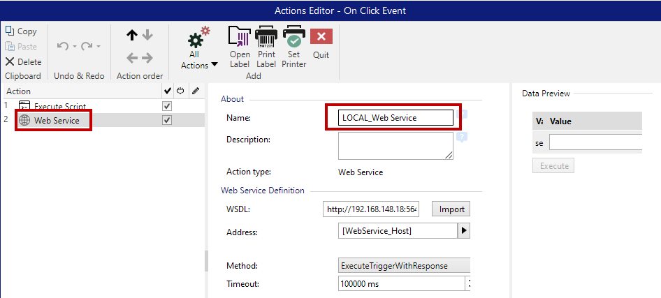 You plan to print product labels. Your trigger would receive only a segment of the required data. E.g. the trigger receives the value for Product ID and Description variables, but not the Price. The price information is available in a separate database, which is accessible over Web service call. Web service defines the function using a WSDL definition. For example, function input is Product ID and its output is Price. The Web Service action sends Product ID to the Web service. It executes and makes an internal look up in its database and provide the matching Price as the result. The action saves the result in a variable, which can be used on the label.