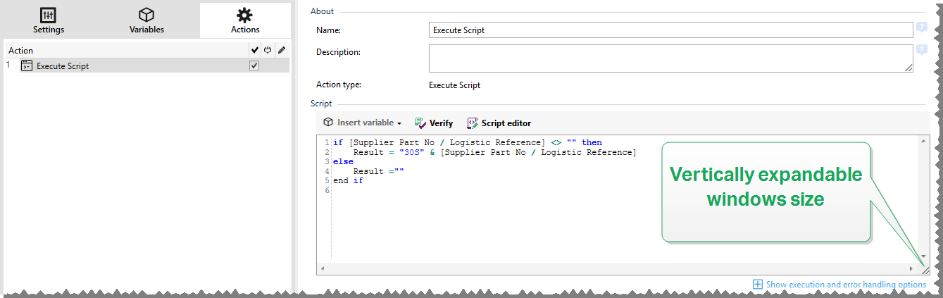 This action enhances the software functionality by using custom VBScript or Python scripts. Use this function if the built-in actions don't meet your data manipulation requirements.