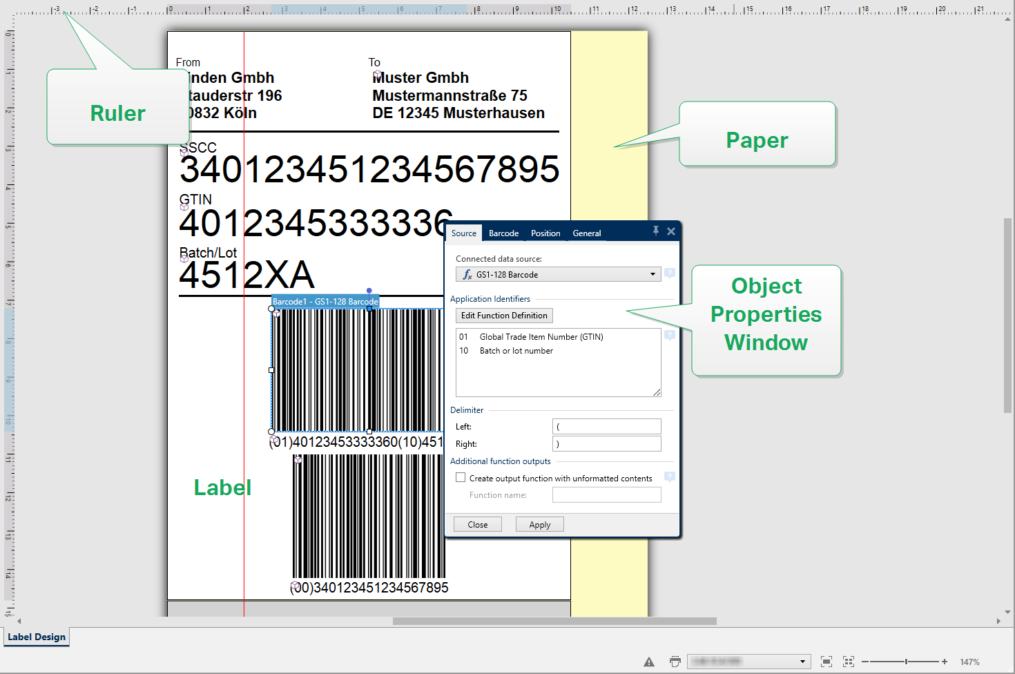 Ruler: Design surface is equipped with horizontal and vertical ruler. Use it to line up the objects or to properly position the label and its content. Change the unit measurements displayed on the ruler in Label Properties.