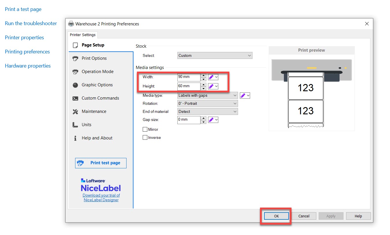 Set your media type Width and Height, and then click OK.
