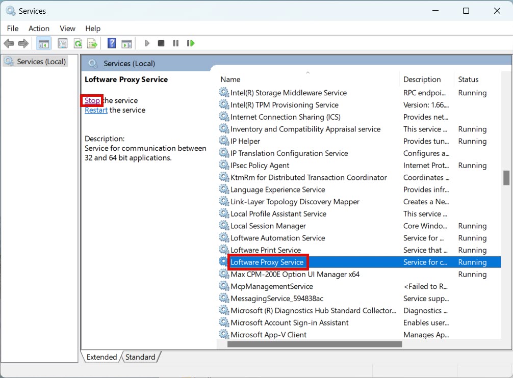 Navigate to Loftware Proxy Service and stop the service.