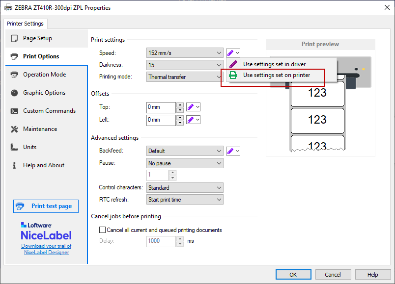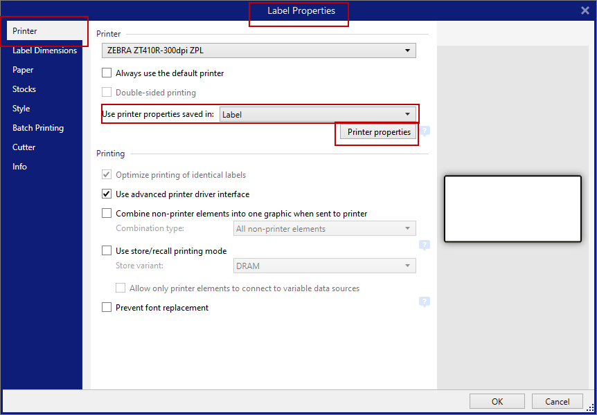 Use printer properties saved in the printer driver. Open the Label Properties and in the Printer tab select Printer Driver.