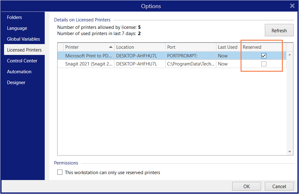 To reserve or unreserve printers in Desktop Designer, Automation and Print: