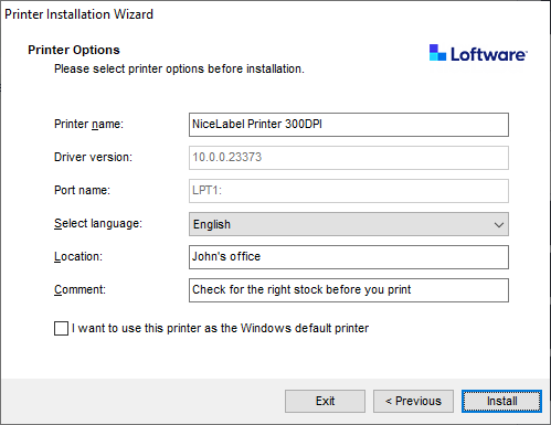 Language settings .Location : adds information about the physical location of your printer. This way you can locate your printer in case there are multiple printers installed on your computer. Location input is just your comment and does not affect driver functionality. You can also add or change your Location data inPrinter Properties >General after you install your driver.Comment : adds additional information or comments about your printer. Use this option also to identify your printer in case you have multiple printers installed on your computer. Comment input is just your remark and does not affect driver functionality. You can also add or change your Comment data inPrinter Properties >General tab after you install your driver.
