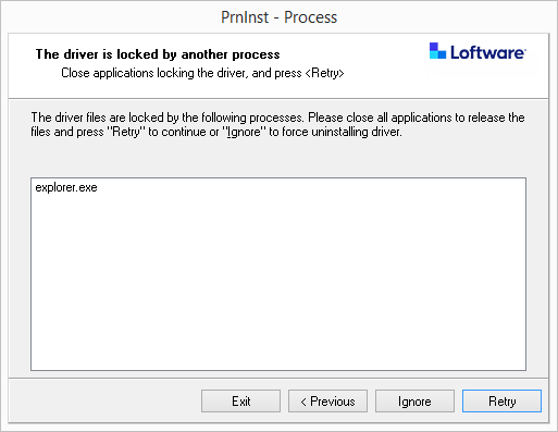 During the installation, PrnInst checks for applications that could lock the printer driver files and prevent the installation. The installation wizard displays locking applications.