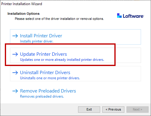 Installation Options window opens. ClickUpdate Printer Drivers option.