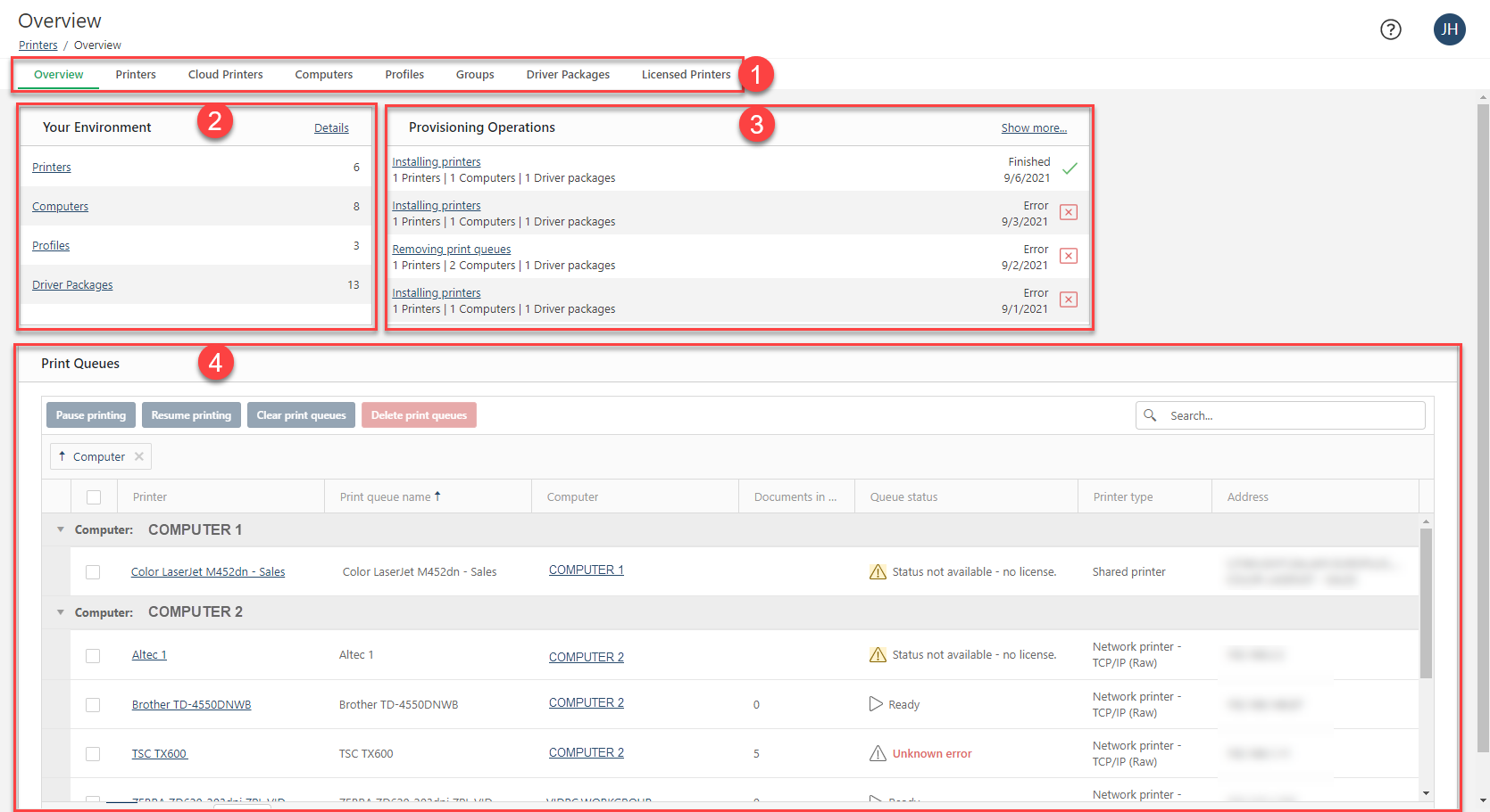 Go to Control Center > Printers > Overview to see information about your centrally managed printing environment, recent provisioning operations, and your list of print queues.