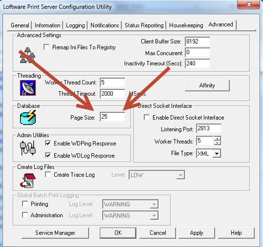 - Once you have selected the desired Page Size select Apply. Once the changes have been applied select the Service Manager, then restart the service.